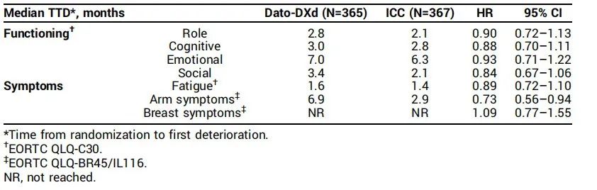 PRO问卷的依从性在两组的基线中为82.5%,并且随着时间的推移各组间保持相似。首次出现TTD的分析中(初步分析)显示,相比于ICC组,Dato-DXd的中位TDD为3.4月vs 2.1月(HR 0.85[95%CI 0.68-1.06]),出现身体机能障碍的时间为5.6月vs 3.5月(HR 0.77[95%CI 0.61-0.99]),出现疼痛的时间为3.5月vs 2.8月(HR 0.85[95%CI 0.68-1.07])。确认出现TTD的分析(敏感性分析)显示,相比于ICC组,Dato-DXd的中位TDD为9.0月vs 4.8月(HR 0.76[95%CI 0.58-0.98]),出现身体机能障碍的时间为12.5月vs 6.2月(HR 0.77[95%CI 0.59-1.01]),出现疼痛的时间为9.0月vs 5.5月(HR 0.72[95%CI 0.55-0.94])。下表显示了EORTC中其他选定的功能和症状量表中的TTD。患者报告的症状性AE(通过PRO-CTCAE和EORTC测量)通常与临床医生报告的安全性数据一致,患者报告的治疗耐受性(通过PGI-TT测量)在各组之间具有可比性。