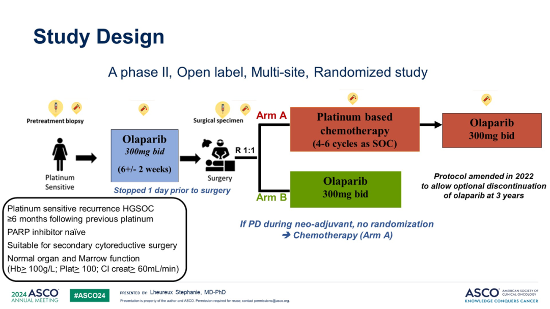 这是一项II期、开放标签、随机研究,针对既往铂类治疗≥6个月后复发的PARP抑制剂初治HGSOC患者。入组患者适合进行二次细胞减灭手术,使用奥拉帕利(300mg口服,每日两次,为期6±2周)新辅助治疗,并在新辅助疗法之前进行了肿瘤活检。术后,患者随机1:1分配至接受6个周期的铂类化疗序贯维持奥拉帕利(A组)或单独奥拉帕利(B组)。主要临床疗效终点是无进展生存(PFS),总生存(OS)是次要终点。根据RECIST 1.1评估疗效,依据CTCAE v4.03标准评估不良反应。转化研究包括通过全基因组测序(WGTS)和纵向循环肿瘤DNA进行的配对肿瘤组织分析。