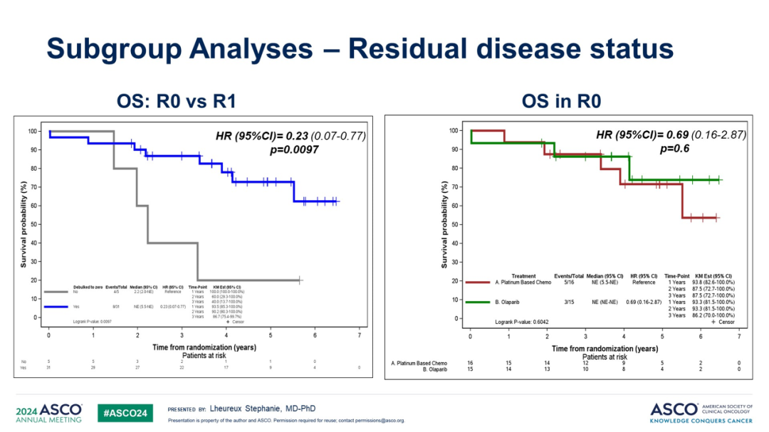 SOLO3研究提示接受奥拉帕利单药治疗的铂敏感复发卵巢癌的患者其死亡风险增加33%,基于此在2022年FDA撤回了奥拉帕利用于卵巢癌的后线单药治疗的适应症,本研究疗效与SOLO3研究结果不同应该是二次减瘤无肿瘤残存的结果,对该研究中两组的远期疗效尚需进一步评估;