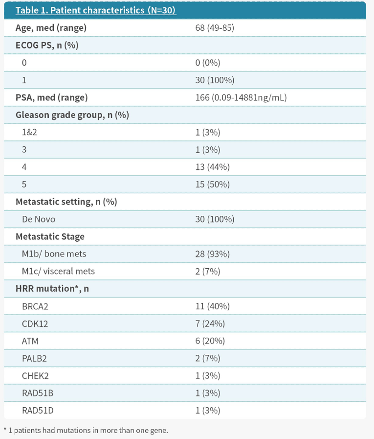这是一个单中心、单臂、Ⅱ期试验(NCT05167175),研究对象为至少携带一个HRR基因突变(BRCA1、BRCA2、ATM、BARD1、BRIP1、CDK12、CHEK1、CHEK2、FANCL、PALB2、RAD51B、RAD51C、RAD51D和RAD54L)的男性mHSPC患者,这些突变通过组织NGS测序确定。患者接受奥拉帕利300 mg BID联合阿比特龙1000 mg QD和泼尼松5 mg QD进行治疗。既往未使用过新型内分泌药物(NHA)治疗。主要终点是由研究者按PCWG3修订版RECIST 1.1评估的1年放射学无进展生存(rPFS)率。次要终点包括前列腺特异性抗原(PSA)反应率、客观缓解率(ORR)和不良事件。
