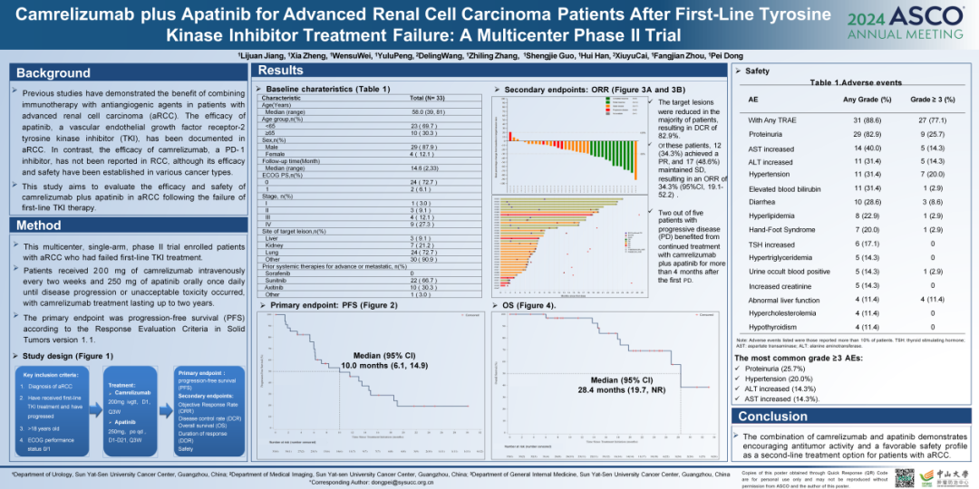 [3]Lijuan Jiang,Xia Zheng,Wensu Wei,et al.Camrelizumab plus apatinib for advanced renal cell carcinoma patients after first-line tyrosine kinase inhibitor treatment failure:A multicenter phase II trial.ASCO 2024;Abstract 4539.
