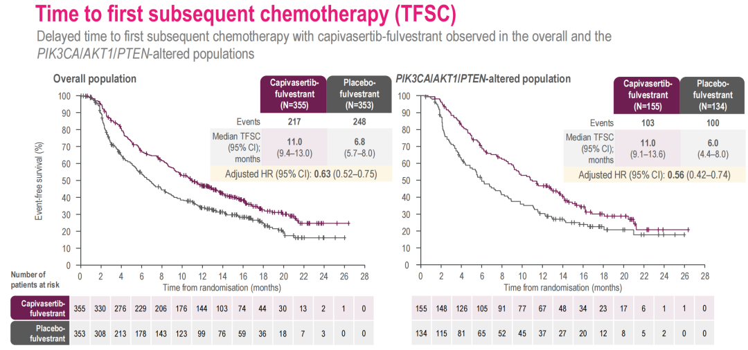 近期举行ESMO-BC大会报道了该研究的更长随访数据[3],卡匹色替可以延长第二次无进展生存期(PFS2):在总人群中,卡匹色替组相较于对照组的PFS2风险比(HR)为0.70;AKT变异人群的风险比则为0.52;此外,卡匹色替还可有效延迟患者首次接受化疗的时间(TFSC,HR 0.56)。这些更长随访的PFS2和TFSC改善,意味着很有可能转化为OS阳性结果,期盼卡匹色替能够进一步为HR+/HER2-晚期乳腺癌经治患者带来显著的OS延长。