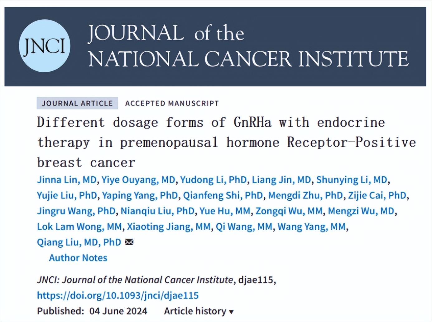为了给上述临床问题寻找答案,刘强教授课题组利用孙逸仙纪念医院的大规模真实世界数据,采用倾向性评分匹配与非劣效性分析,回顾性分析了1M或3M GnRHa联合SERM或AI治疗早期绝经前HR+乳腺癌患者中的有效性和安全性,该研究结果近日发表在国际著名杂志Journal of the National Cancer Institute,:Different Dosage Forms of GnRHa with Endocrine Therapy in Premenopausal Hormone Receptor-Positive Breast Cancer。