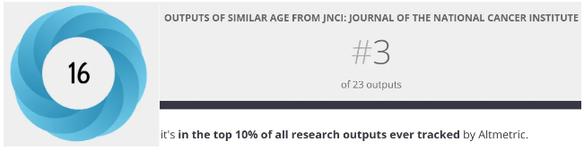 由于该论文的重要临床意义,在评审过程中受到审稿人的一致高度评价,其中一个审稿人评价:“This is a very important issue with little available data to guide current practice and I applaud the authors’efforts to better understand this issue.”,另一个审稿人也评价“This remains a clinically relevant question and this is a large cohort.The authors do thoughtful STEPP analysis propensity matching to...”。文章在线发表不到一周,即受到广泛关注和转载,Altmetric Score达16,在同期JNCI发表的23篇文章中排名第三。