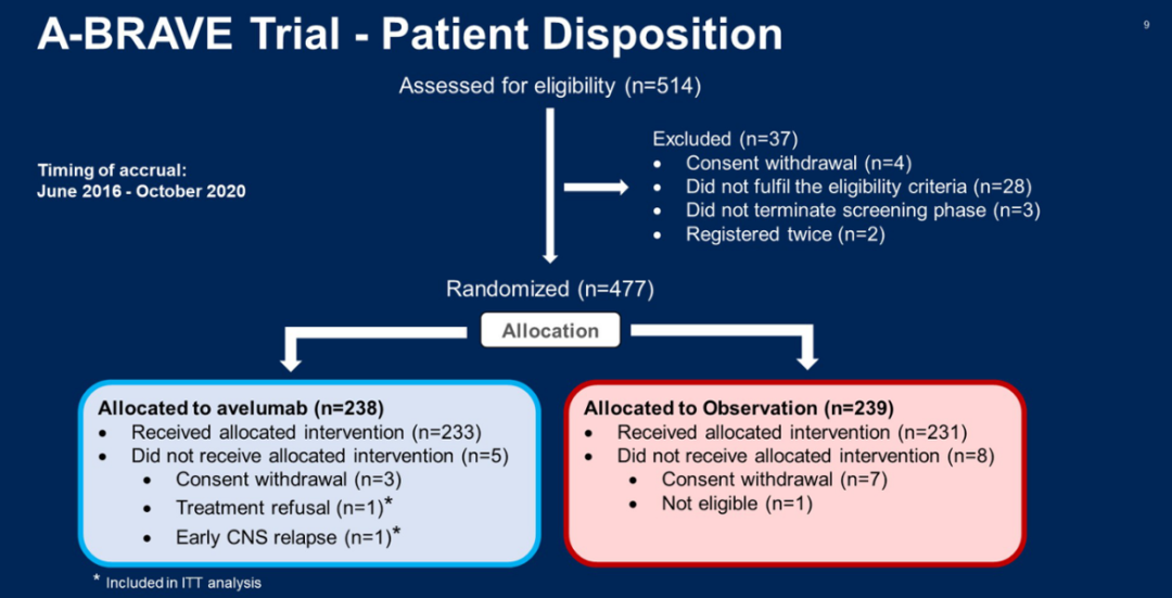 2016年6月至2020年10月,来自意大利64个中心和英国6个中心的477例患者被随机分配。11例患者(阿维鲁单抗组3例,对照组8例)在随机分配后立即撤回同意书,并被排除在进一步分析之外。378例患者进入B层(82%),其中99例患者(阿维鲁单抗组57例,对照组42例)在加入试验前接受了进一步的术后化疗。