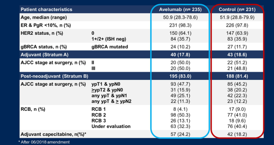 A-BRAVE是一项Ⅲ期、多中心、随机临床试验,比较了为期1年阿维鲁单抗治疗和观察治疗在早期高复发风险TNBC中的疗效。患者在完成包括手术和新辅助/辅助化疗在内的标准治疗后入组。高风险定义为:1、初次手术后>pN2/任何pT、pN1/pT2或pN0/pT3(A层),2、新辅助化疗后残留浸润性病灶(乳房和/或淋巴结)(B层)。