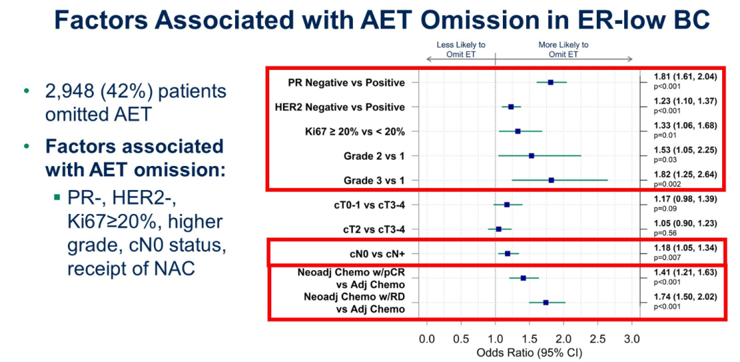 结果:共识别出357 085例I-III期ER+BC患者,其中10 396例(3%)被归类为ER低表达型。在ER低表达型疾病患者中,69%为PR阴性,67%为HER2阴性。大多数(77%)患者接受了化疗(32%为新辅助化疗,44%为辅助化疗,1%未知化疗时间)。在这7 956例患者中,有3 233例(41%)省略了AET。与PR阳性相比,PR阴性的肿瘤患者省略AET更为常见(46%vs 30%,P<0.001),HER2阴性与阳性相比也更为常见(44%vs 37%,P<0.001),Ki67≥20%的患者同样更为常见(44%vs 35%,P<0.001)。