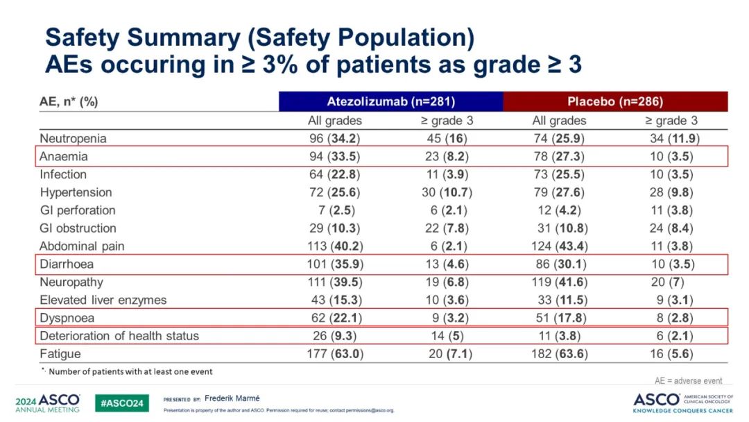 在不良事件(adverse events,AEs)方面,阿替利珠单抗组和安慰剂组的≥3级AEs发生率为71.5%和68.9%,严重AEs分别占63.7%和51.4%,特别值得关注的不良事件(adverse events of special interest,AESIs)分别为18.5%和8.0%(图5)。贝伐珠单抗相关的AESIs发生率在两组之间相似(6.8%vs 5.2%)。不良事件导致停止用药的比例在阿替利珠单抗组为16.4%,在安慰剂组为14.3%。阿替利珠单抗组和安慰剂组最常见的≥3级AEs分别是中性粒细胞减少症(16.0%vs 11.9%)、高血压(10.7%vs 9.8%)、贫血(8.2%vs 3.5%)、胃肠道阻塞(7.8%vs 8.4%)和疲劳(7.1%vs 5.6%)。阿替利珠单抗组中,12.5%的患者出现≥3级免疫介导不良事件,而安慰剂组为5.9%,最常见的是胰腺炎(3.9%和1.4%)(图5)。此外,相关探索性分析,如粪便微生物组、肿瘤微环境、cDNA和替代PD-L1分析仍在进行中。