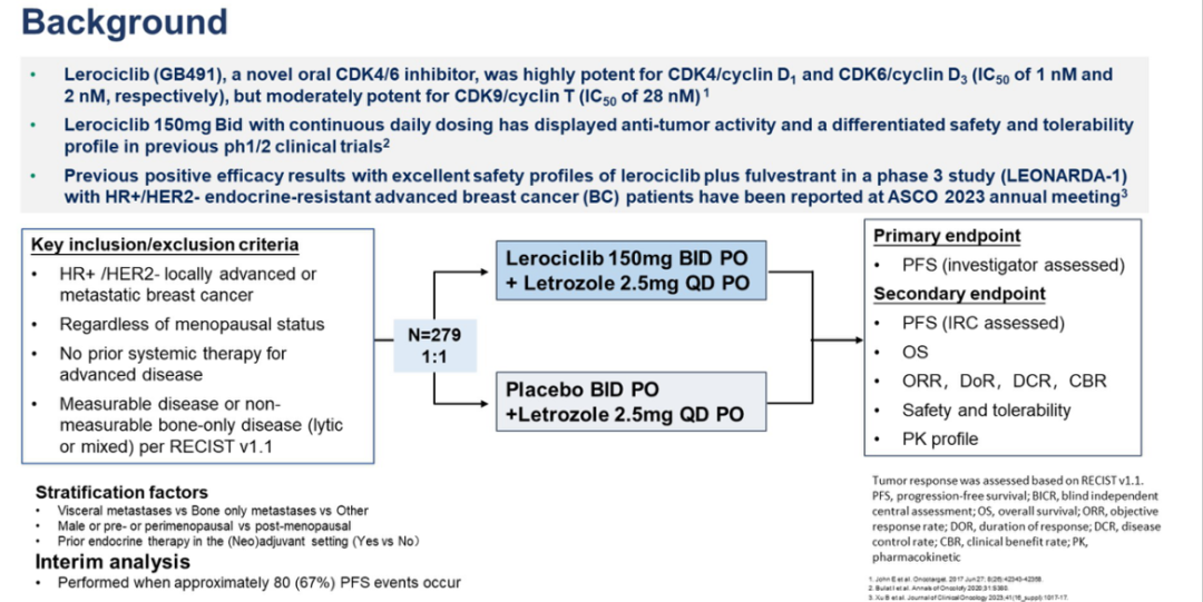 LEONARDA-2是一项随机、双盲、安慰剂对照的Ⅲ期研究,入组了HR+/HER2-晚期或转移性乳腺癌患者,这些患者在晚期既往未接受过系统治疗。患者按1∶1的比例随机分配至lerociclib(每日两次,每次150 mg)联合来曲唑组或安慰剂联合来曲唑组。主要研究终点是由研究者评估的PFS。次要终点包括由盲法独立中心审查(BICR)评估的PFS、客观缓解率(ORR)、总生存期(OS)和安全性等。中期分析计划在PFS事件达到约80例时进行。
