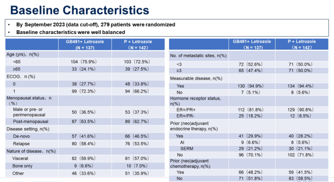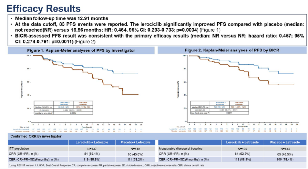 截至2023年9月20日,共有279名患者被随机分配(137名患者接受lerociclib+来曲唑治疗,142名患者接受安慰剂+来曲唑治疗),中位随访时间为12.91个月。基线特征在各组之间相似。