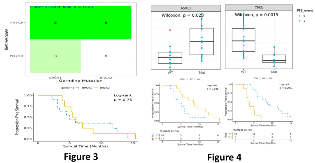 在生物标志物分析中,对主要队列中24名gBRCA1/2突变的患者进行了700个基因的NGS(下一代测序)。在gBRCA1和gBRCA2突变之间,ORR或PFS没有显著差异。XPO1的体系突变(16名患者(73%),15/18 PR+CR,1/4 SD+PD)与治疗响应呈显著相关。体系TP53突变与较短的PFS显著相关,而ASXL1突变与较长的PFS显著相关。四种体系突变(AR_c.1418_1420del、AR_c.231_239dup、2个DUSP22突变)在PD样本中均显示出一致的下降趋势,而NF1_c.3198-4dup在PD样本中显示出一致的上升趋势。