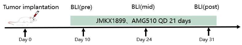 为了验证新型KRAS G12C抑制剂JMKX001899在伴有脑转移的KRAS G12C突变NSCLC中的活性,本研究采用小鼠模型研究其疗效。5-6周龄雌性Balb/c裸鼠颅内植入H358-Luc和H23-Luc细胞。使用基线生物发光成像(BLI)监测肿瘤负荷,并通过Living Image软件计算总通量值。植入后10天,开始每日一次口服vehicle(模型对照组)、sotorasib(剂量100mg/kg、30mg/kg)和JMKX001899(100mg/kg、30mg/kg),以10mg/kg作为起始剂量,持续21天。