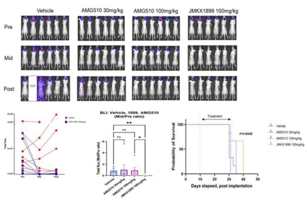 H358-Luc异种移植物对JMKX001899治疗反应特别好。14天和0天BLI总通量比值:vehicle组vs.sotorasib 100mg/kg组vs.JMKX001899 100mg/kg组为0.85 vs.0.89 vs.0.01(P<0.05)。