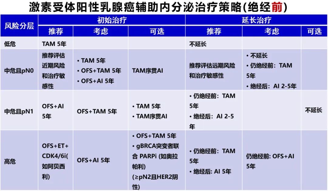 2024 CACA乳腺癌诊治指南与规范将HR+早期乳腺癌术后患者分为低危、中危和高危三类人群,根据绝经状态予以推荐:①对于绝经前人群:推荐低危患者选择单药TAM治疗5年,不推荐强化治疗;高危患者需要强化内分泌治疗,推荐OFS联合内分泌治疗联合CDK4/6抑制剂,推荐5年后仍处于绝经前的患者接受TAM治疗5年,5年后转为绝经后状态的患者采用AI治疗5年;中危且pN0患者的治疗方案以及治疗时长应依据“近期复发风险和治疗敏感性”,中危且pN1患者被推荐接受OFS+AI治疗5年,5年后仍绝经前的患者继续接受TAM治疗5年,绝经后状态的患者AI治疗2-5年。②对于绝经后人群,低危患者首选AI治疗5年,也可以选择TAM 5年;高危患者接受AI联合CDK4/6抑制剂,推荐延长5年AI治疗;中危患者AI治疗5年后,pN0患者根据“远期风险和治疗敏感性”决定是否延长内分泌治疗,pN1患者延长AI治疗2-5年。