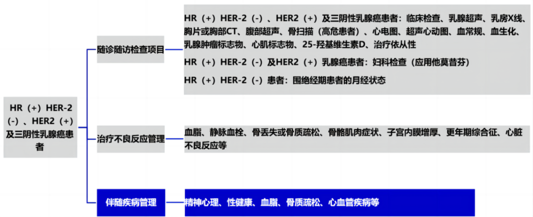 《中国乳腺癌随诊随访与健康管理指南(2022版)》介绍了不同分型乳腺癌患者全方位随诊随访路径,强调全方位健康管理。所有乳腺癌患者均应定期随访,无症状患者建议仅行基本项目随访(临床体检、乳腺超声、乳腺X线、胸片或胸部CT、腹部超声、骨扫描、血常规、血液生化、乳腺癌标志物和妇科检查等);有症状的乳腺癌患者进行加强随访项目复查,比如出现乳腺新发肿块、胸壁新发皮疹或结节、新发淋巴结肿大、骨痛、胸痛、持续性头痛、持续咳嗽或呼吸困难、新发肝脏肿大或右上腹部疼痛、新发癫痫的患者。