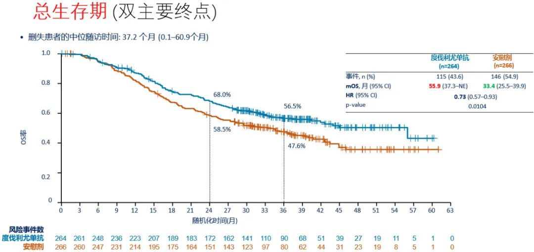 2024 ASCO报道的同步放化疗后度伐利尤单抗巩固治疗的研究结果是LS-SCLC领域的重要进展(ASCO 2024,LBA5)。国际多中心III期研究ADRIATIC(NCT03703297)纳入同步放化疗后未进展的LS-SCLC患者,分入三个治疗组(度伐利尤单抗组、度伐利尤单抗联合Tremelimumab组、安慰剂组)。首次期中分析显示,度伐利尤单抗组和安慰剂组的中位OS分别为55.9个月和33.4个月(HR=0.73;P=0.0104),中位PFS分别为16.6个月和9.2个月(HR=0.76;P=0.0161)。