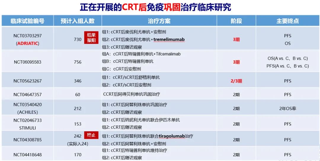 一系列探索放化疗后免疫巩固治疗的II期和III期研究正在开展中,免疫治疗方式包括单免和双免,采用的免疫治疗药物包括阿得贝利单抗、阿替利珠单抗、特瑞利珠单抗、舒格利单抗、阿替利珠单抗+Tiragolumab(抗PD-L1+TIGIT)、度伐利尤单抗+Tremelimumab(抗PD-L1+CTLA4)等。