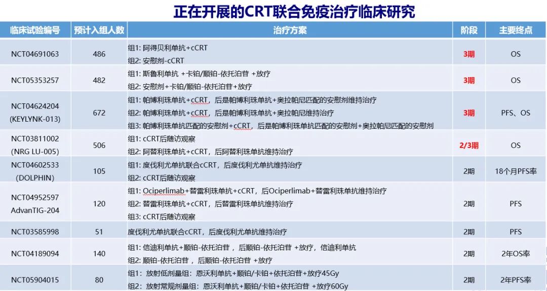 一系列探索放化疗联合免疫治疗的II期和III期研究正在开展中,采用的免疫治疗药物包括阿得贝利单抗、阿替利珠单抗、斯鲁利单抗、度伐利尤单抗、信迪利单抗、恩沃利单抗联等,部分研究针对最佳放疗剂量进行了探索。为了进一步提高疗效,KEYLYNK-013研究将对比CRT vs.免疫+CRT vs.CRT+免疫+PARPi方案;AdvanTIG-204研究正在评估CRT vs.免疫+CRT vs.CRT+免疫+TIGIT单抗方案。
