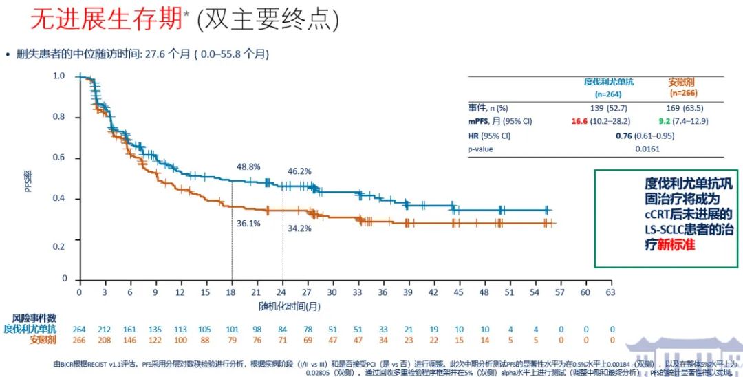 一项单中心、单臂、开放II期前瞻性研究纳入50例LS-SCLC患者,给予同步放化疗+度伐利尤单抗治疗,之后每4周接受一次度伐利尤单抗巩固治疗,最长2年,并建议预防性颅脑照射。中位随访时间26.6个月时,研究方案的中位PFS为14.4个月,中位OS未达到,PCI组与未PCI组相比脑转移事件显著减少(Park S,et al.Eur J Cancer.2022 Jul;169:42-53.)。