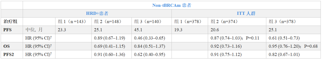 关于次要终点,中期分析显示在HRD+人群中,组3(CP+B+D+O)的总生存(OS)与对照组相比有改善趋势(HR=0.84;95%CI 0.51–1.37),但在ITT人群中没有OS获益(HR=0.95;95%CI 0.76–1.20)。