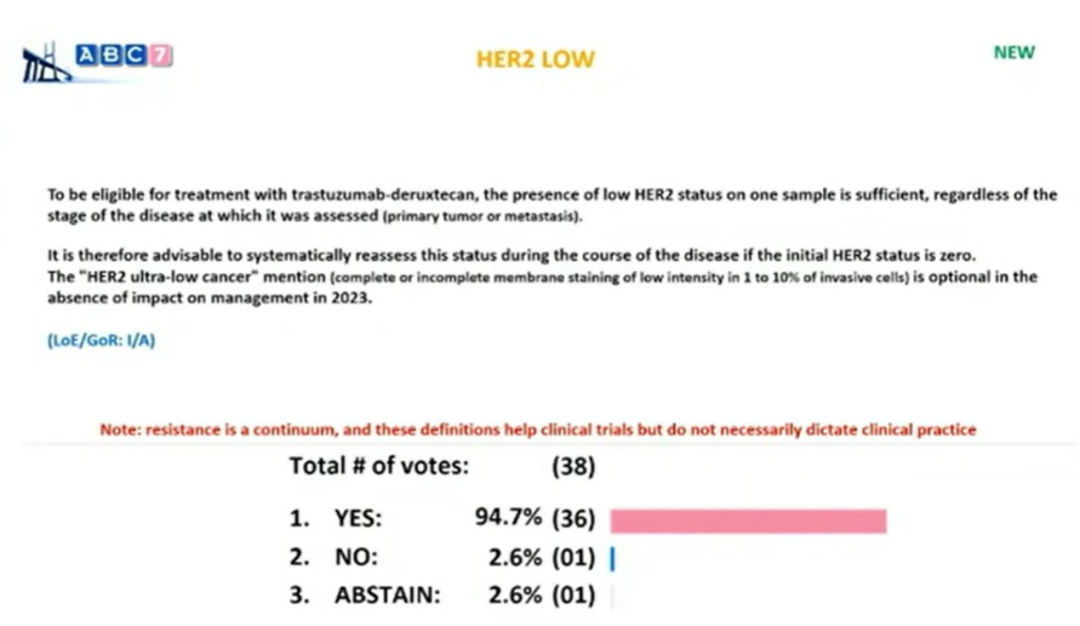 第七届晚期乳腺癌国际共识会议(ABC7)对这个问题也做了投票,94.7%的专家赞同“无论评估的是疾病分期或检查部位(原发灶或转移灶),只要有一个样本检测到HER2低表达,就符合T-DXd的治疗条件。
