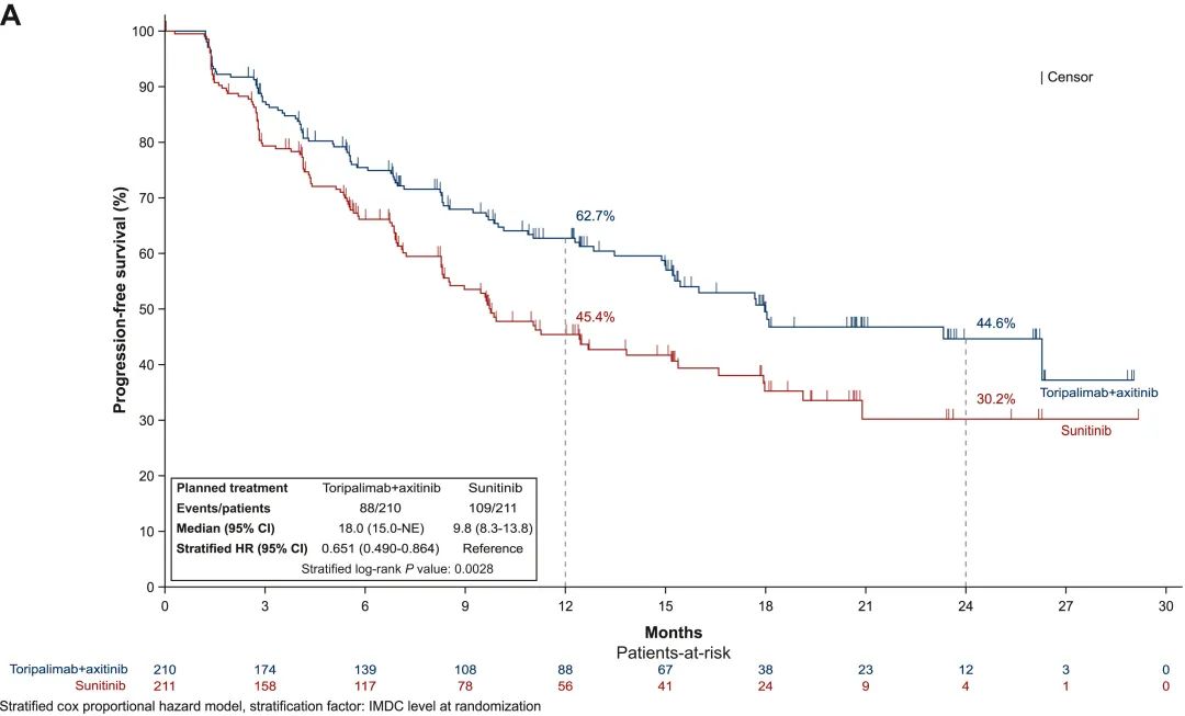 董培教授:随着RENOTORCH研究[1]结果的公布和发表,标志着我国晚期肾癌正式进入靶免联合治疗时代。这项研究结果表明,阿昔替尼联合特瑞普利单抗能够显著提升晚期中高危肾癌患者的PFS(18.0个月vs 9.8个月;P=0.0028)和OS(NE vs 26.8个月),并且能够显著降低35%的进展风险;这也证实,采用国产免疫检查点抑制剂联合靶向治疗,同样能够取得良好疗效。同时这项治疗方案也获得国家药品监督管理局(NMPA)批准,用于中高危的不可切除或远处转移性肾细胞癌患者一线治疗。但现状是我国虽已批准相关适应证,而目前的医保并未纳入PD-1单抗特瑞普利单抗的肾癌治疗,因而临床实践中需要使用这类方案时,患者并不能享受医保待遇,这也是目前仍存在的未被满足的临床需求之一。