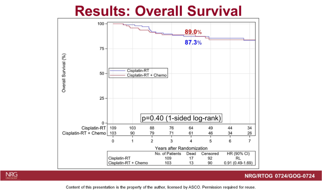 而且,我们也注意到GOG-0724研究中有一部分患者在手术和同步放化疗之后再进行辅助化疗的期间,发生了很严重的不良反应,导致化疗不能够按期结束,因此化疗的效果没能最大程度的发挥,这可能也影响了研究的结果。