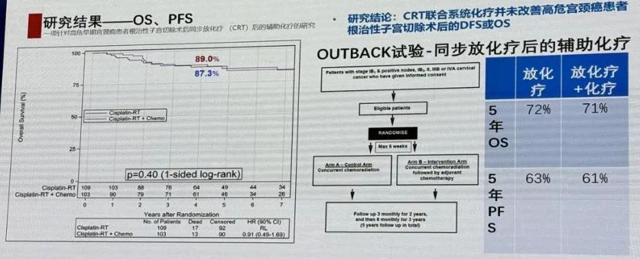往届ASCO会议公布的OUTBACK研究在局部晚期宫颈癌(鳞状细胞癌、腺鳞癌或FIGO 2008 IB1期伴淋巴结受累的腺癌,或IB2、II、IIIB或IV期)患者中对比放化疗后辅助治疗vs单独放化疗,也得出阴性的结果。