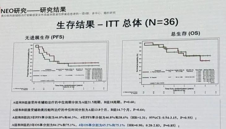 NEO研究结论:①在二次肿瘤细胞减灭术后病变完全切除的患者中,单独使用奥拉帕利与化疗后使用奥拉帕利一样有效,并且单独使用毒性较小;②在这项研究选定的人群中,通过靶向治疗进行降阶治疗存在可能性;③需要进一步的临床和转化研究来研究患者的无化疗选择。