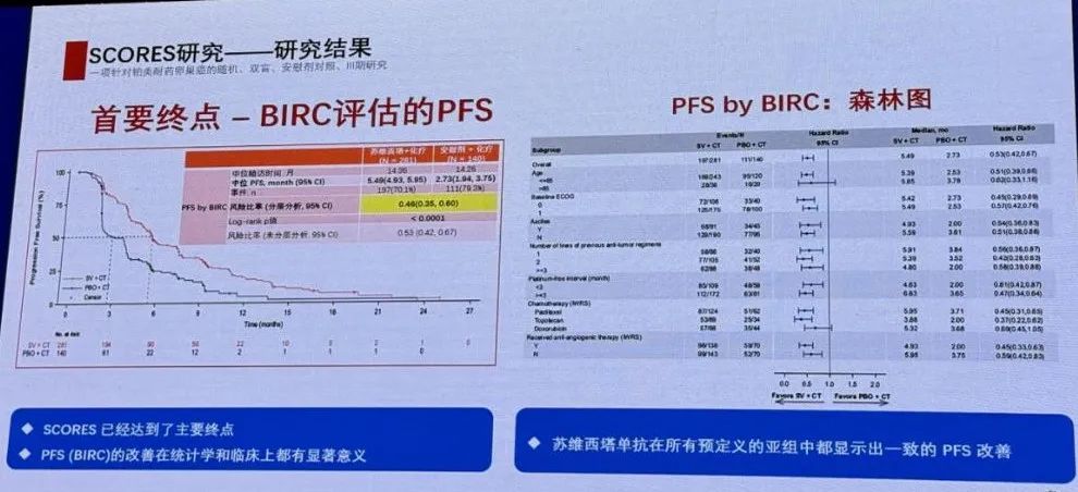 SCORES研究结论:①SCORES达到了其主要终点:与单独化疗相比,苏维西塔单抗联合化疗在所有预定义亚组中显示出具有统计学意义和临床意义的PFS改善;苏维西塔单抗联合化疗也改善了ORR、DCR和DOR;②OS数据尚不成熟,在苏维西塔单抗组中已显示出明显的OS获益趋势;③苏维西塔单抗的安全性是可控的。