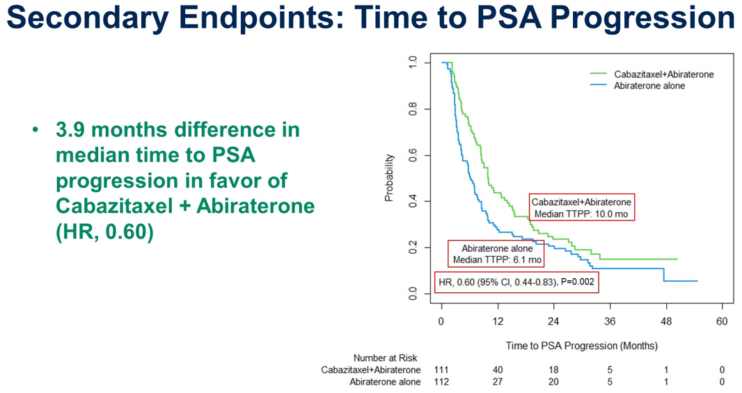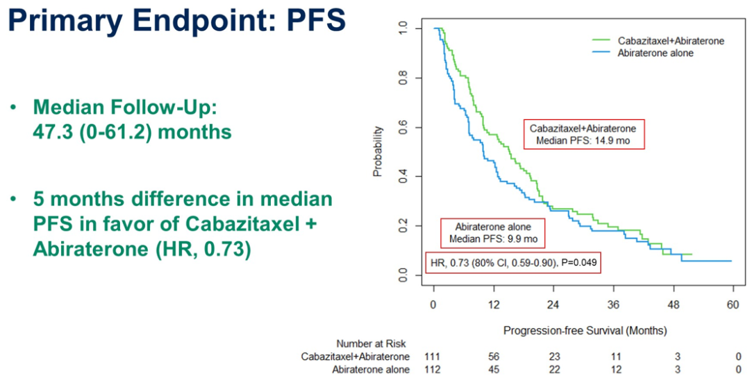 中位随访47.3个月时,卡巴他赛+阿比特龙/泼尼松组的中位PFS更长(14.9个月vs.9.9个月,P=0.049;HR 0.73,80%CI 0.59-0.90)。联合治疗在以下组别更为显著:65岁以下患者(15.6 vs.9.8个月,P=0.08)、ECOG PS为0(20.9个月vs.10.1个月,P=0.01)、CRPC时间<12个月(12.9个月vs.5.1个月,P=0.006)以及无内脏转移(18.1个月vs.10.1个月,P=0.01)。联合治疗组的中位TTPP也比单药治疗组长(10个月vs.6.1个月,P=0.002)。在中期分析中,组间无OS差异(25.0个月vs.26.9个月,P=0.67)。使用卡巴他赛的副作用与预期一致,联合治疗组报告了更多>3级副作用。