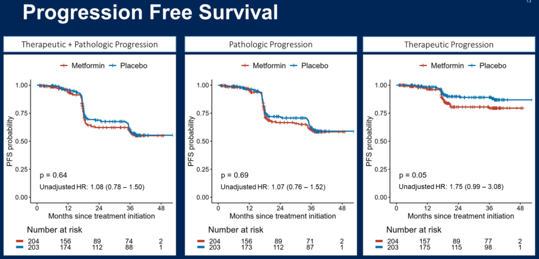 在407名患者中,204人接受了二甲双胍治疗,203人接受了安慰剂。整个队列的中位年龄为63岁。在407名患者中,141人出现疾病进展。接受二甲双胍治疗的患者与接受安慰剂的患者之间,没有观察到无进展生存期(PFS)的统计学显著差异(P=0.64)。