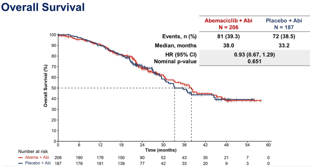 从2018年11月到2022年7月,共入组393名患者。组间基线特征一致。rPFS的主要终点未达到(HR 0.83;P=0.212),阿贝西利联合阿比特龙组的中位rPFS为22.0个月,安慰剂组为20.3个月。盲法独立中央审查的rPFS与研究者评估一致(HR 0.84)。OS是一个关键次要终点且未经假设检验(HR 0.93;成熟度38.9%)。其他次要终点包括PSA进展时间(HR 0.637)、症状进展时间(HR 0.768)和最严重疼痛进展时间(HR 0.935)。