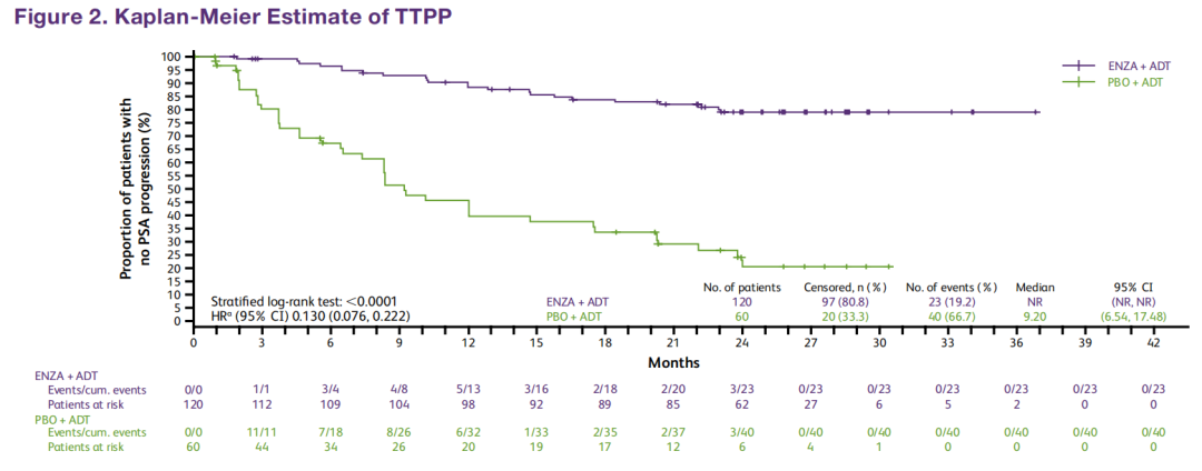 China ARCHES是一项在中国开展的多中心、双盲、随机对照3期研究,在全国27个中心纳入了180例mHSPC患者,随机(2:1)接受恩扎卢胺+ADT或安慰剂+ADT治疗,主要终点是至PSA进展时间(TTPP),次要终点包括rPFS、至去势抵抗时间(TTCR)、ORR等。去年在ESMO大会报道的研究结果显示达到了主要终点:恩扎卢胺组的PSA进展风险显著降低87%(TTPP:HR 0.130,P<0.0001)。