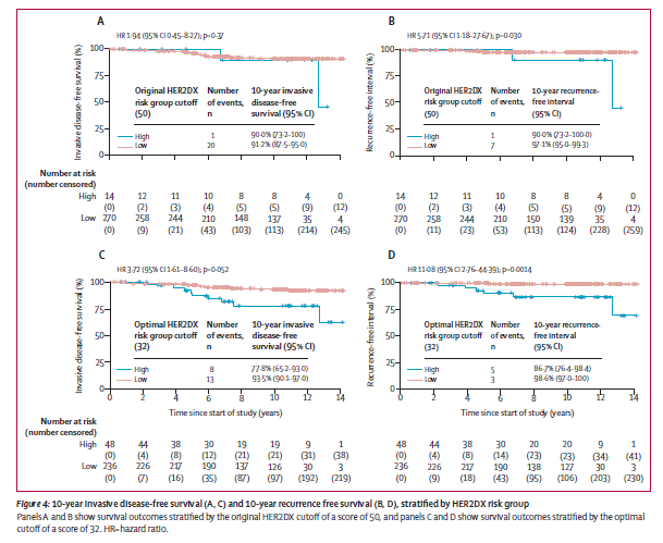 图6按HER2DX风险组分层的10年无浸润性疾病生存期(A,C)和10年无复发生存期(B,D)