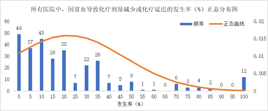 在处方化疗方案的患者中,因CIA导致化疗剂量减少或延迟的发生率均值为22%,较2022年调研结果的24%略有降低[11]。调研还发现,三甲医院因CIA导致的化疗减量或延迟略低,中位数为15%vs 13%,可能与针对性的予以贫血纠正治疗的比例更高相关。