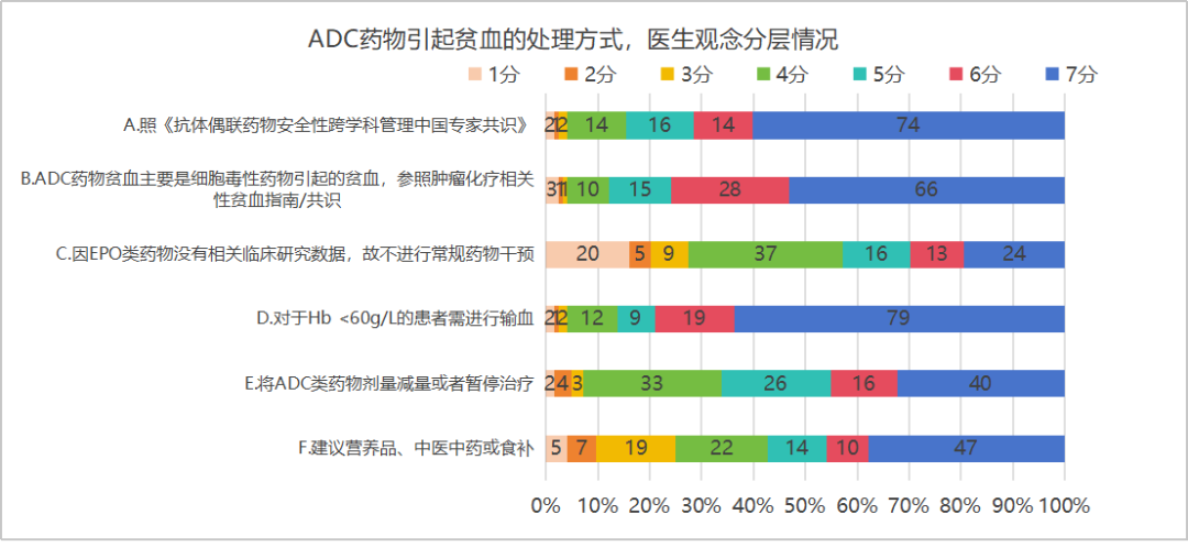 问卷题:ADC类药物的贫血,您如何进行处理?(打分,1-7分,4分为中立,7分为强烈建议,1分为反对,很不建议)