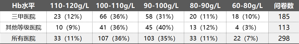 问卷题:在您的临床实践中,对于化疗后出现贫血的患者,在化疗期间您会将患者的Hb水平维持在哪个范围?(单选)