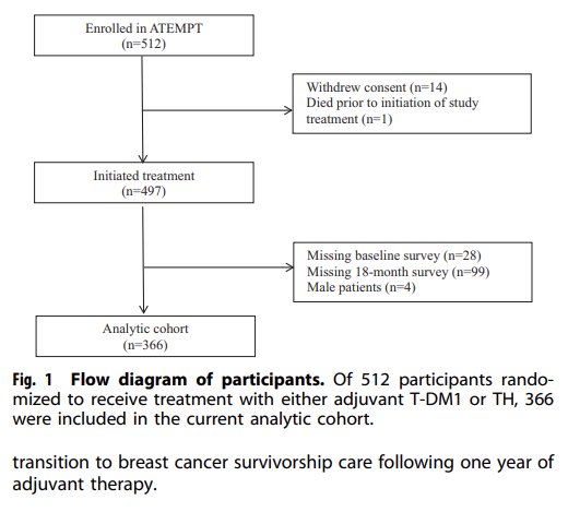 本项事后分析旨在比较ATEMPT研究中年轻(≤50岁)和老年(>50岁)女性入组后18个月的停药率、患者报告毒性和生活质量。本次事后分析在排除无基线(n=28)或18个月评估(n=99)的参与者和男性参与者(n=4)后,将T-DM1组和TH组按3:1的比例随机匹配了366例患者(图1),报告了其入组18个月后的停药情况,使用多变量模型比较按年龄、治疗组分层后的患者报告的毒性和生活质量(QOL)。