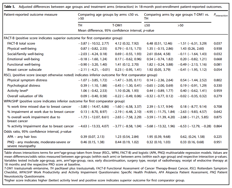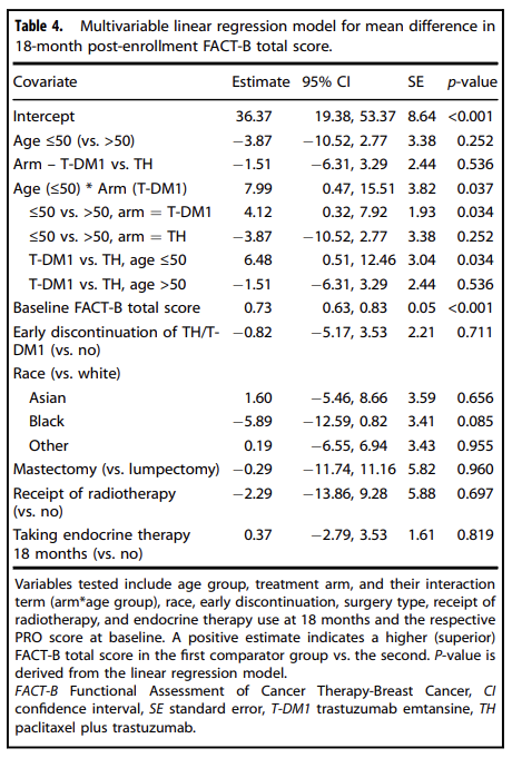 基线和18个月的PRO评分按治疗组别和年龄组分层后汇总状况见图5。多变量分析显示,18个月时癌症治疗-乳腺癌功能评估(FACT-B)更好的总分与FACT-B更好的基线总分相关(估计平均差0.73,P<0.001),与年龄或治疗组无关(图6)[2]。在≤50岁组中,T-DM1治疗较TH治疗与更好的18个月FACT-B总分相关,估计平均差异为6.48分(95%CI 0.51-12.46),与最小重要差异(MID)阈值7-8分接近。