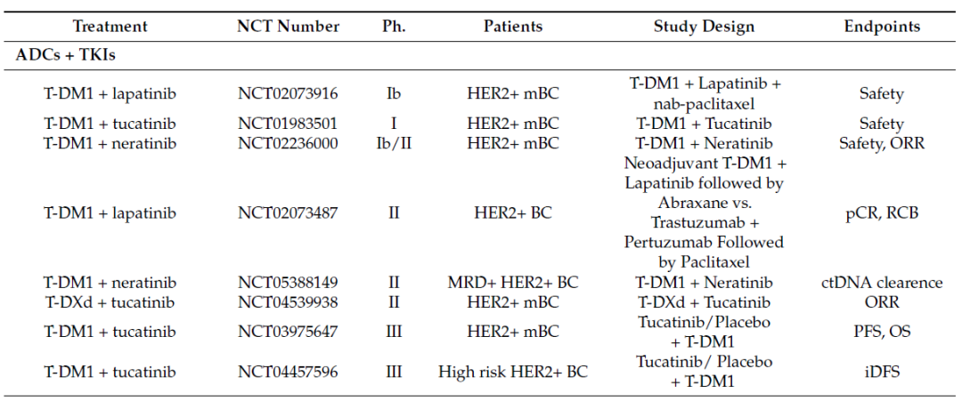 双重HER2阻断比单药治疗更有效,酪氨酸激酶抑制剂(TKIs)可结合HER的胞内结构域。TKI和ADC联合可改善受体内化,增加ADC有效载荷的摄取,克服与HER2表达减少相关的耐药性。在一项剂量递增研究中,T-DM1基础上联合奈拉替尼显示出初步临床疗效,19例可评价患者中有12例(63%)达到客观缓解。此外前文提到p95HER2高表达会导致对T-DM1产生耐药,该研究中2例p95HER2高表达患者使用联合方案获得完全缓解[16]。HER2CLIMB02研究评估了T-DM1联合图卡替尼的疗效,mPFS显著改善长达9.5个月。目前多项ADC联合TKI的临床研究正在进行中。