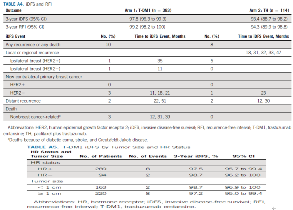 T-DM1组共10例患者发生侵袭性疾病事件或死亡:2例远端复发,2例局部或区域复发,3例为对侧原发性乳腺癌(HER2阴性),3例为研究治疗无关的非乳腺癌相关死亡。T-DM1组的三年iDFS率为97.8%(图5A),超过了方案预设的95%。3年RFI为99.2%(95%CI,98.2-100;图5B,图6-A4)。肿瘤大小为<1cm和≥1cm的患者、HR阳性和HR阴性患者的生存结果相似(图5C、图5D)。