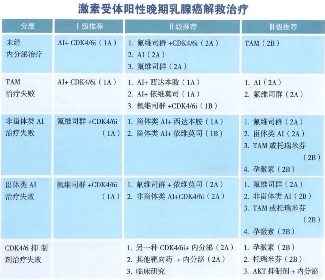 CDK4/6抑制剂治疗失败:I级推荐空缺;II级推荐为另一种CDK4/6抑制剂+内分泌(2A),其他靶向药+内分泌(2A),或参加临床试验;也可以给予孕激素、托瑞米芬或AKT抑制剂+内分泌治疗。