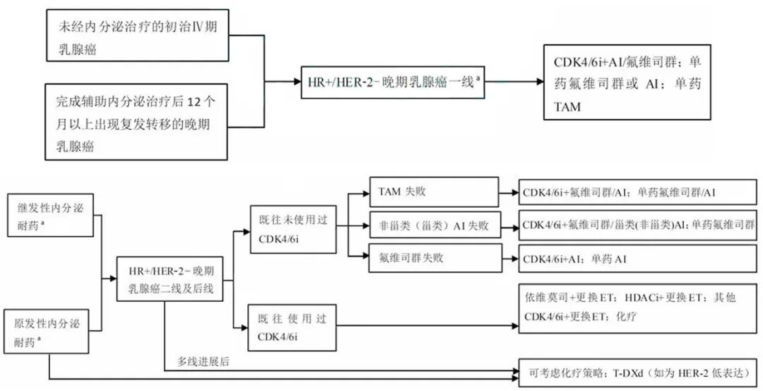 无论是未经内分泌治疗的初治IV期患者,还是完成辅助内分泌治疗后12月以上出现复发转移的患者,一线治疗首选CDK4/6抑制剂+AI/氟维司群,若CDK4/6抑制剂不可及,也可以选择单药氟维司群或AI,甚至单药TAM;