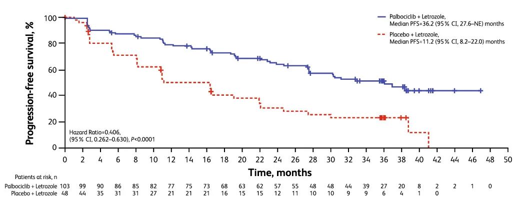 在PALOMA-2研究中,哌柏西利+AI相比单用AI延长仅骨转移患者的PFS[1]