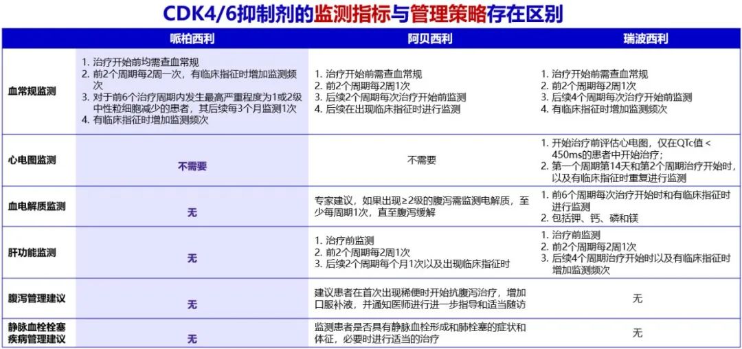 监测指标差异:各种CDK4/6抑制剂因不良反应各具差异,需要监测的指标不同。与其他CDK4/6抑制剂相比,哌柏西利需要监测的指标较少,仅需常规监测血常规,临床管理和随访更为便捷。使用其他CDK4/6抑制剂可能需要监测心电图、血电解质、肝功能、腹泻、静脉血栓栓塞的情况。