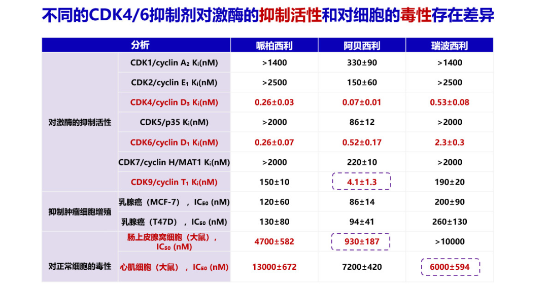 作用机制差异:不同CDK4/6抑制剂的结构、作用位点、对激酶的抑制活性以及在细胞中的毒性作用均有所区别,药代动力学参数之间也存在差异。具体而言,三种CDK4/6抑制剂都显著抑制CDK4/6和cyclin D的结合。与其他CDK靶点相比,哌柏西利对CDK4和CDK6的亲和力高100倍以上;而阿贝西利额外对CDK9有强抑制,可能导致腹泻等反应的发生;阿贝西利对小肠上皮细胞的毒性强于哌柏西利或瑞波西利;阿贝西利和瑞波西利对心肌细胞的毒性强于哌柏西利。哌柏西利半衰期长,仅需每日1次给药,方便患者用药;阿贝西利半衰期短,需每日2次给药。
