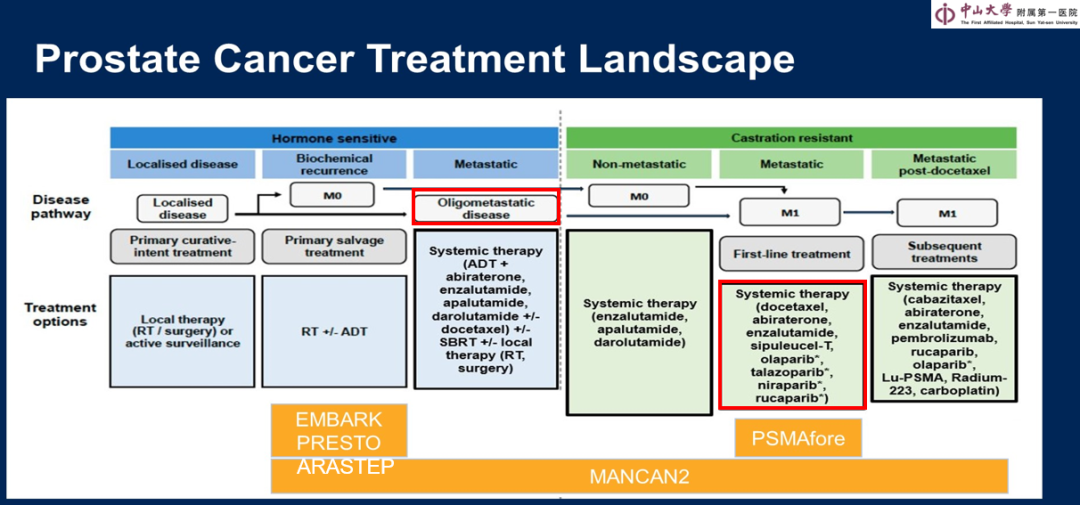 从前列腺癌的发展过程而言,外科医生可能更为关注局部晚期和生化复发阶段,一系列研究(EMBARK、PRESTO、ARASTEP等研究)也探索了二代抗雄药物及放疗的疗效;目前而言,挽救性放疗是治疗生化复发患者的指南推荐意见,但尚无标准的药物治疗方案。对于寡转移前列腺癌而言,目前也在有效系统治疗的基础上探索了局部手术方案。而对于晚期前列腺癌,包括PSMAfore研究、MANCAN2研究以及中山大学附属第一医院的相关研究,也在分析一线和二线治疗的更优抉择。