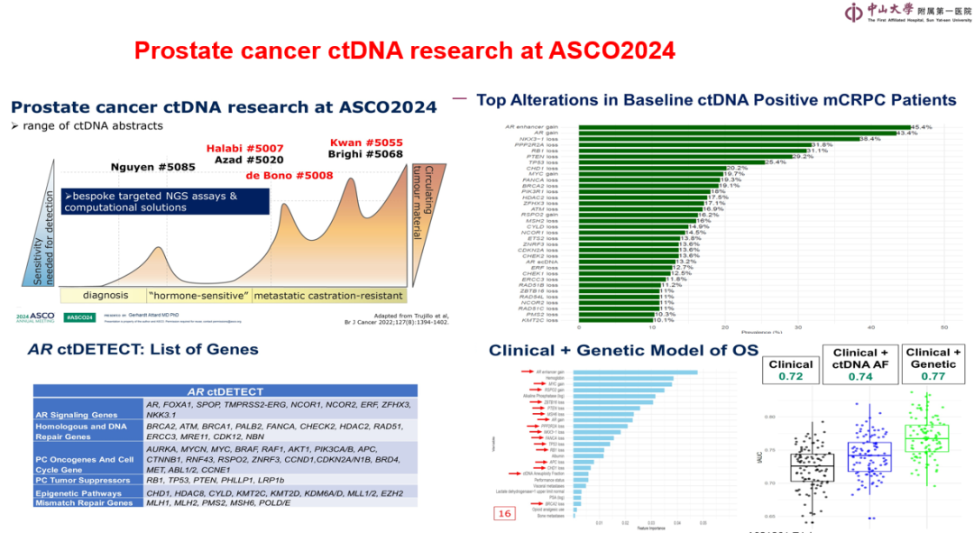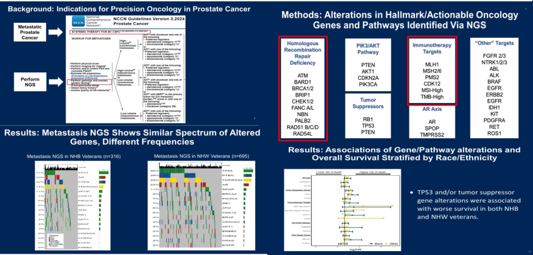 近期更新的美国NCCN指南2024年第3版已经明确推荐转移性前列腺癌进行NGS基因检测,目前发现的相关基因包括:同源重组修复缺陷基因,如ATM、BARD1、BRCA1/2、CHEK1/2等等;PI3K/AKT通路,包括PTEN、AKT1、CDKN2A、PI3CA等;肿瘤抑制基因,如RB1、TP53、PTEN等;免疫治疗靶点,如MLH1、CDK12、MSI-High等等;AR通路,如AR、SPOP等。此外,还有膀胱癌通路的FGFR2/3、肾癌中的EGFR等相关通路变异,也会出现于前列腺癌。