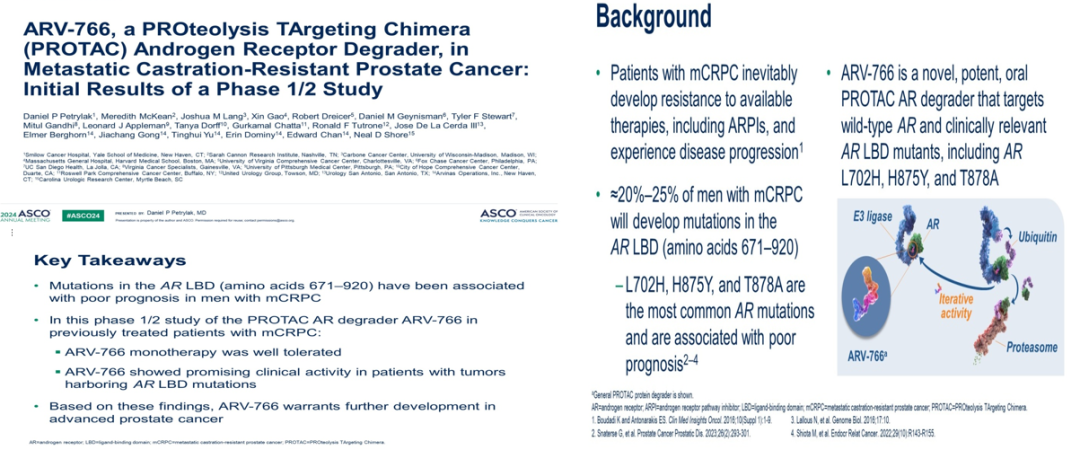 另一项研究分析了ARV-766,这是一种新型、强效的口服PROTAC雄激素受体降解剂,该研究进行了1/2期剂量爬坡探索,研究结果发现,对于既往接受过NHA治疗且发生疾病进展的mCRPC男性患者使用ARV-766进行治疗,患者耐受性良好,并且携带AR LBD突变患者的潜在临床活性较大。